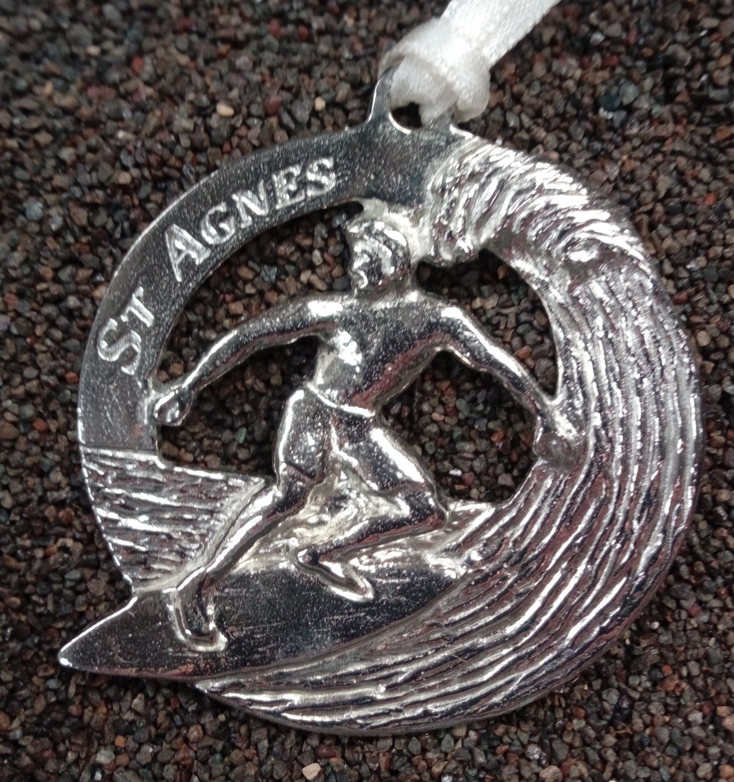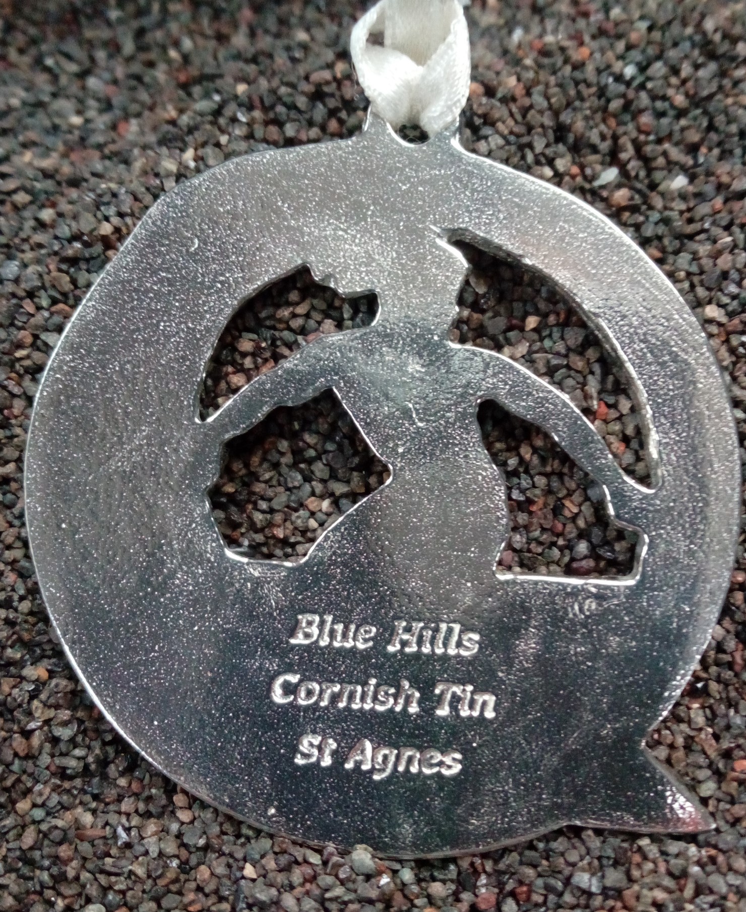 New to our range is this Surfer Christmas Tree decoration cast from Cornish Tin with with following wave. Approximately 45mm diameter with a ribbon to hang it from. Would make a lovely addition to your Christmas decorations and ideal for the surfer in your family.. It is handmade here at Blue Hills Tin mine. Each one is sold boxed along with a certificate of authenticity. We collect our tin ore along the North Cornwall coast around St Agnes under special licence from the Duchy of Cornwall.